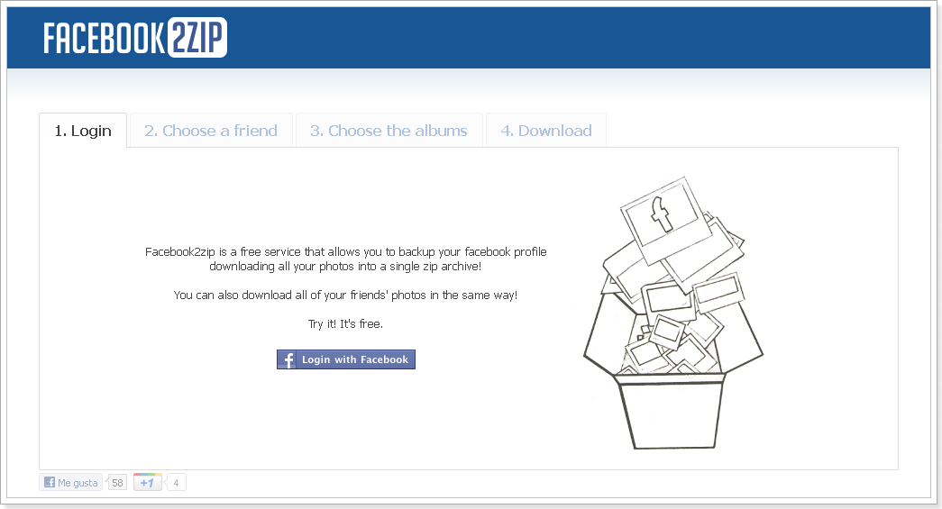 Facebook2zip es un servicio rápido que te permitirá respaldar tus fotos de Facebook si así lo deseas, descargándolas en un único archivo comprimido. Presionando la tecla ‘Ctrl’ puedes bajarte múltiples álbumes, todos ordenados y en cuestión de segundos, pues el servicio es bastante ágil y eficaz.